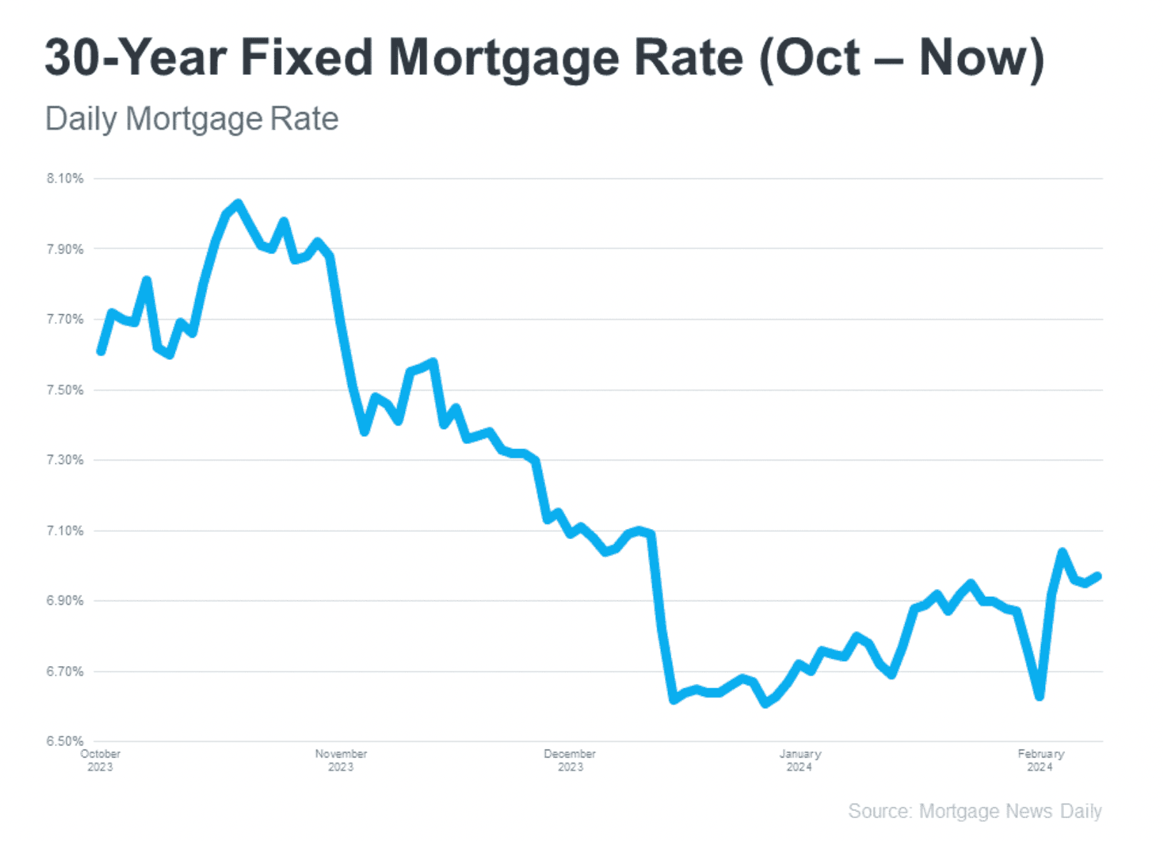 Take a look at the graph below. It uses data from Mortgage News Daily to show the ebbs and flows in the 30-year fixed mortgage rate since last October: